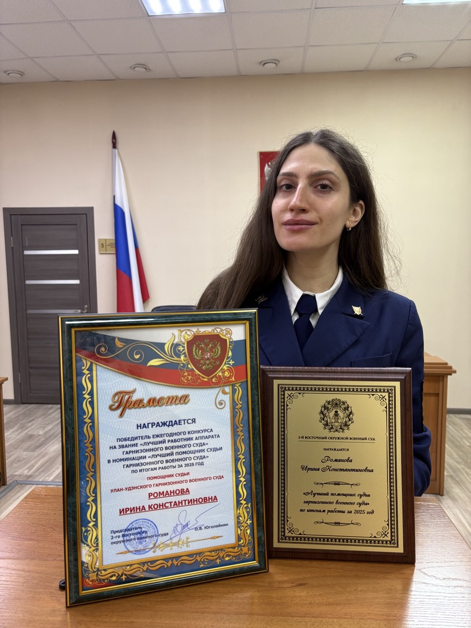 По результатам профессионального конкурса, проводимого 2-м Восточным окружным военным судом, в номинации «Лучший помощник судьи» победила помощник судьи Улан-Удэнского гарнизонного военного суда Романова Ирина Константиновна. Конкурс проводился среди военных судов подведомственных 2-му Восточному окружному военному суду и состоял из нескольких этапов. Ирина Константиновна показала самые высокие показатели в служебной деятельности, успешно справилась со всеми этапами конкурса и одержала заслуженную победу. Романова И.К. с 2023 года замещает должность помощника судьи Улан-Удэнского гарнизонного военного суда. Имеет классный чин «Советник юстиции 3 класса». |
